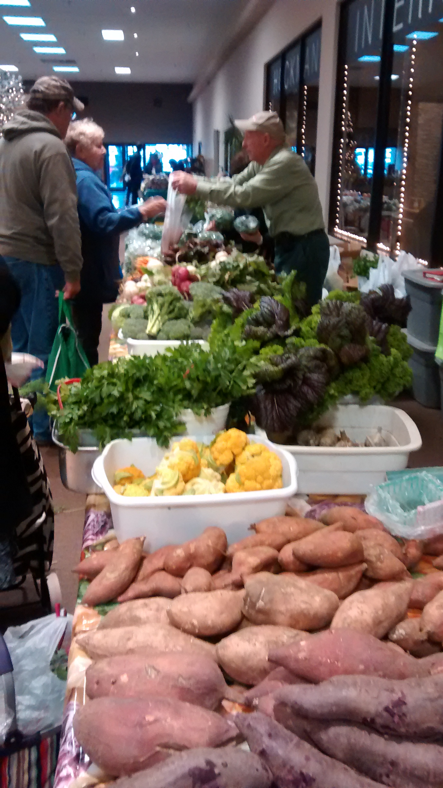 CSA season is over now, but Winter Farmer’s Market is going strong! Look at that gorgeous chard, and those bright yellow cauliflower. Notice, too, that there are FOUR types of sweet potatoes here. From back to front, we have: